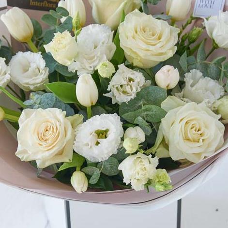 An elegant celebration of sleek white tulips, in magically minimalist packaging. Expect at least 8 white tulips, plus other fresh blooms and gorgeously contrasting foliage.