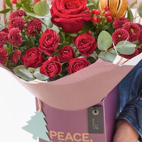 A fabulous festive gift box handcrafted by their local florist, featuring blooms in rich red and green shades, with peach and cream highlights and pops of burgundy and cerise.