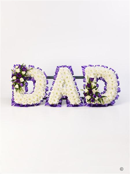 A mass of white double spray chrysanthemums is finished with delicate sprays of roses and lisianthus in white and purple to create this Dad tribute.