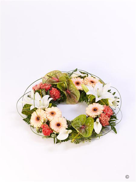 An elegant wreath featuring an exotic mix of anthuriums, calla Lily, Gerbera, Lily and carnations in green, orange and white. Tropical foliage and looped steel grass give it a contemporary feel. Approximate diameter 50cm (19 inches).