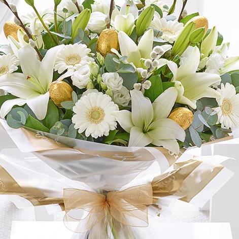Featuring cream LA lilies, natural pussy willow, white germini and white lisianthus with eucalyptus, salal and foil-covered chocolate Easter eggs, wrapped and presented in Interflora Gift Packaging.