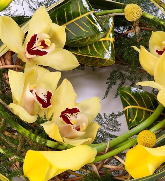 Yellow calla Lily and cymbidium orchids are entwined with cornus Stems, craspedia and asparagus fern around a circular willow frame to create this woodland wreath. Approximate diameter 60cm (23 inches).