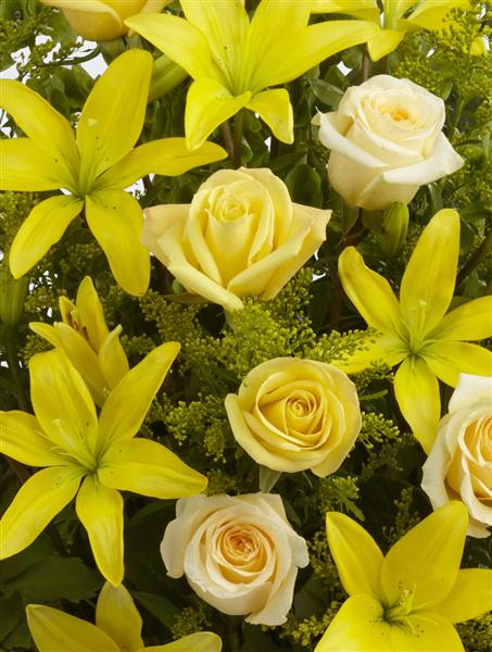 Yellow Asiatic Lily, roses and solidago are offset by cream roses, molucella, palm fronds and choice foliage to create a vibrant display. Arranged in a large papier mache urn, this beautiful display will make a lovely addition to the service.