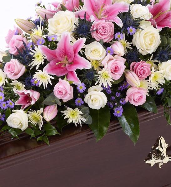 A selection of pink and white Rose are arranged with stunning pink Oriental Lily, blue eryngium, white spray chrysanthemums, lilac September flowers and a selection of foliage to create this beautiful casket spray. Approximate height 122cm (4ft).